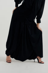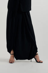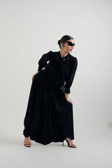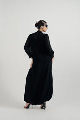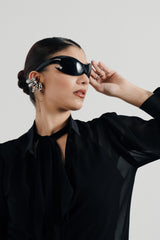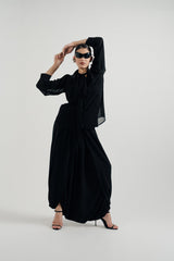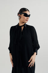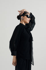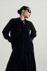Black Silk Chiffon Shirt with Point Collar, Self-Tie Neck Bow, Detachable Camisole, and Button Cuffs, Blending Ease with Elegance.