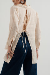 Beige Linen Shirt with Point Collar, Button Closure, and Elongated Back with Slit Tie Detail. A Relaxed Wardrobe Staple with Charming Details.