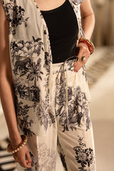 White Printed Trouser Crafted from Luxurious Maple Silk, Featuring a Stylish Print and Comfortable Fit.