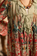 Green Mid-Length Shirt Dress Crafted from Lightweight Korean Chiffon, Featuring an All-Over Printed Design for a Flowing and Elegant Look.
