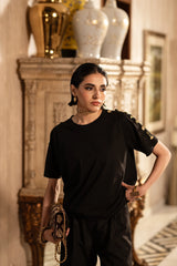 This women’s round-neck T-shirt offers a comfortable regular fit, ideal for everyday wear. Gold button detailing on both sides brings a chic and sophisticated touch. A stylish staple that easily elevates any casual outfit.