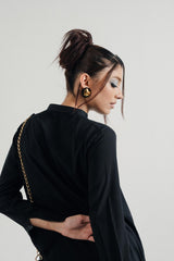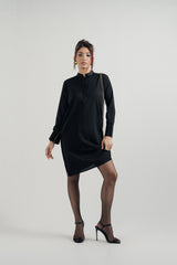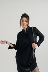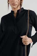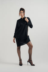 Black Silk Shirt with a Band Collar, Full Sleeves, and Front Chain Detail. A Timeless Piece with Subtle Edge.