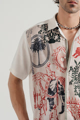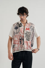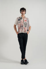 Boxy Relaxed Fit Shirt in White with Multicolor Print. Crafted from fine Irish Linen, it features a Camp Collar, Short Sleeves, and Printed Patchwork Accents, creating a Refined statement for Everyday Wear.
