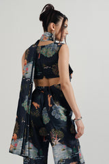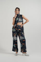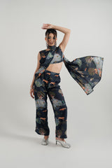 This silk co-ord captures elegance in motion, enhanced by a detachable draped scarf that lends a graceful accent. The sleeveless blouse pairs effortlessly with high-waisted flared pants, creating a look of timeless poise.
